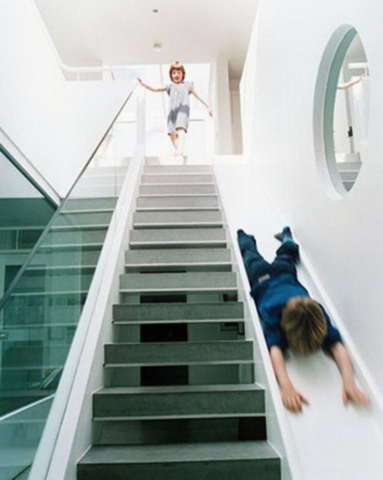 Tous les petits enfants en rêve: un toboggan à la place d'un escalier. Et pour les parents, c'est plus rassurant car le toboggan est inclus dans les escaliers. Ce n'est pas un drap posé sur les escaliers. Bref, c'est un escalier qui conviendra à toute la famille. Et aussi, les adultes ne sont-ils pas de grands enfants? Il existe de nombreux modèles d'escaliers de ce type. Celui de la photo a été imaginé par l'architecte londonien Alex Michaelis à la demande de ses enfants. Le site internet de l'entreprise d'architecture de cet architecte: www.michaelisboyd.com